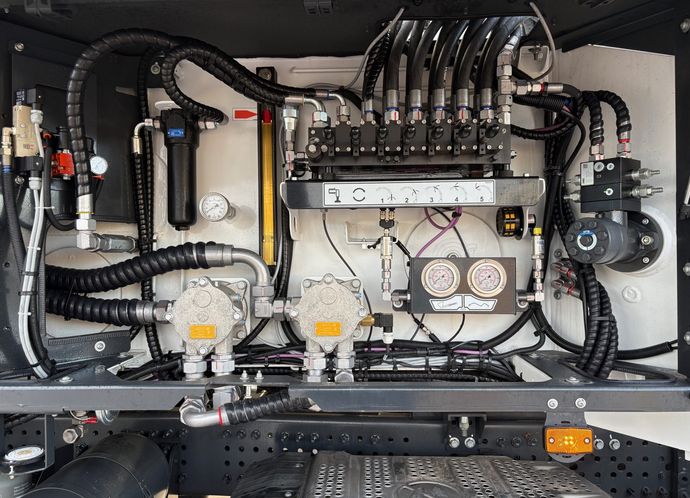 Powered by chassis mounted P.T.O. system with variable displacement pump and geared pump for auxiliary circuit